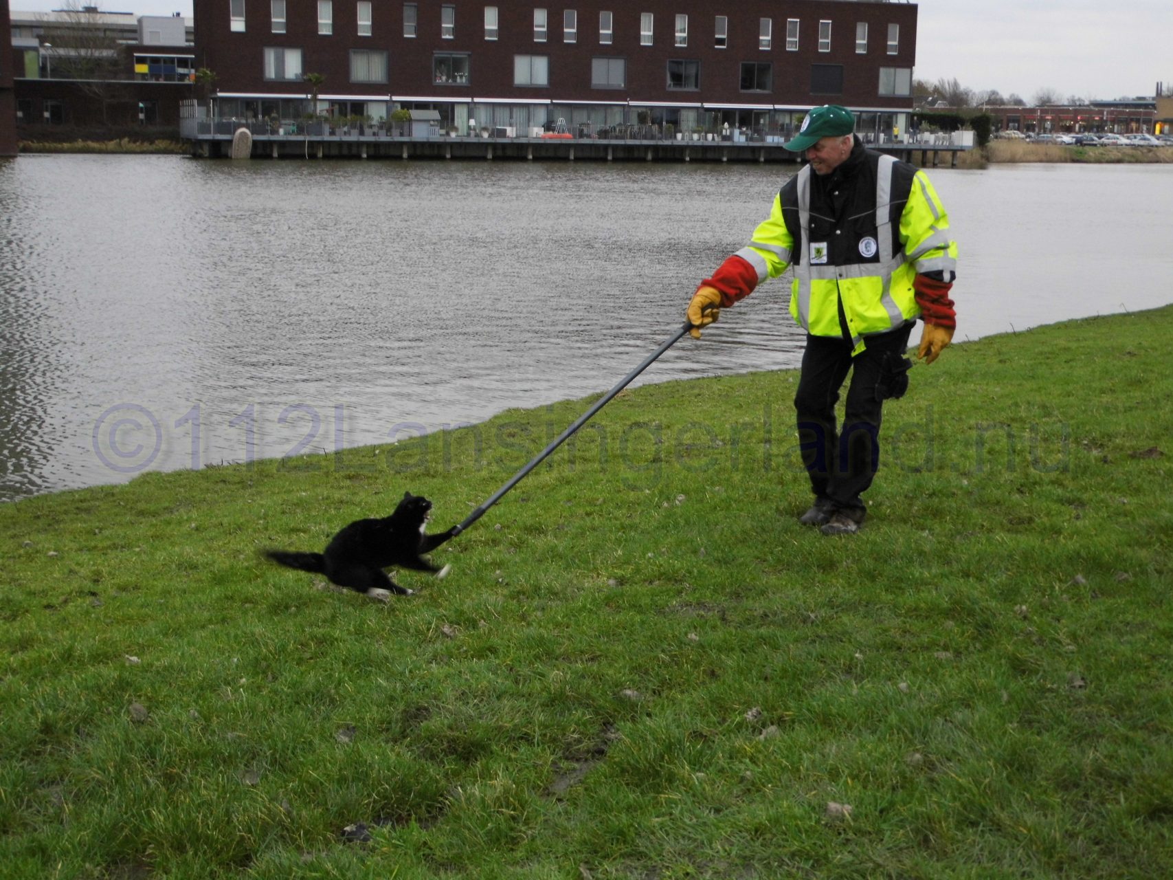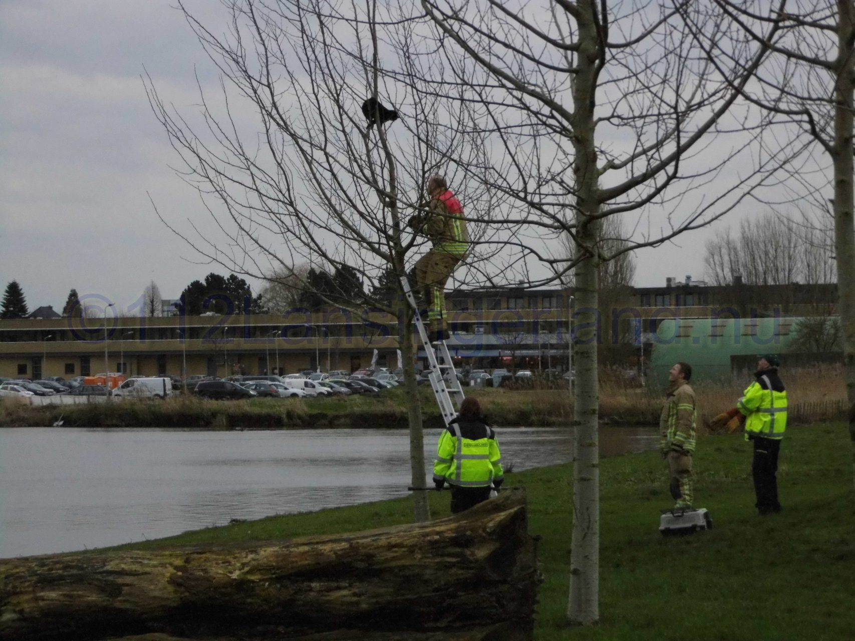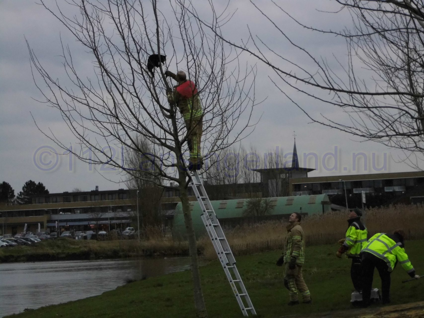 De dierenambulance werd in eerste instantie gebeld. De medewerker van de dierenambulance lukte het niet om de kat uit de boom te halen en schakelde hiervoor de brandweer in. De brandweer heeft de kat uit de boom gekregen. Nadat de kat op de grond was wilde de medewerker van de dierenambulance de kat meenemen, echter ontsnapte de kat en kwam hij in het water terecht. De brandweer is toen nogmaals in actie gekomen en heeft de kat uit het water gehaald. De kat is meegenomen door de dierenambulance voor controle.