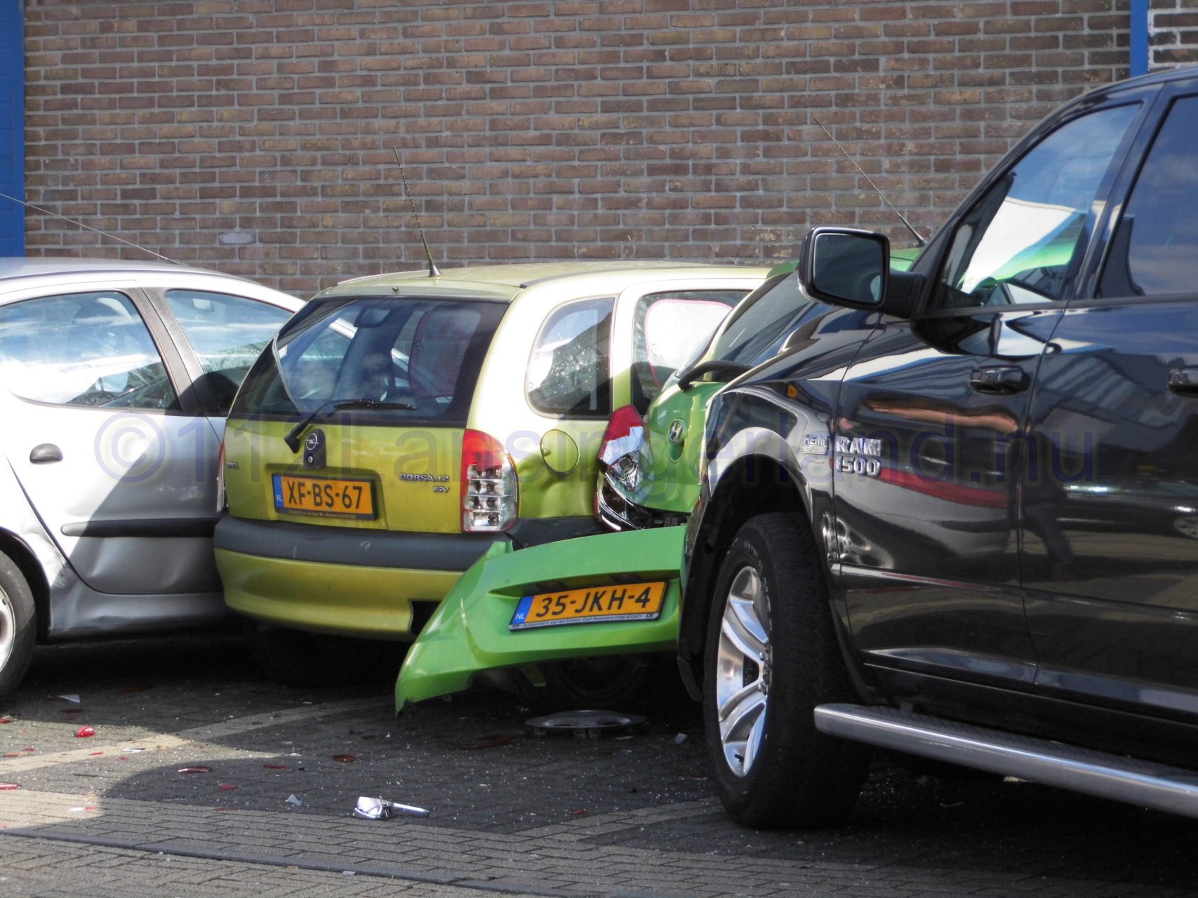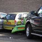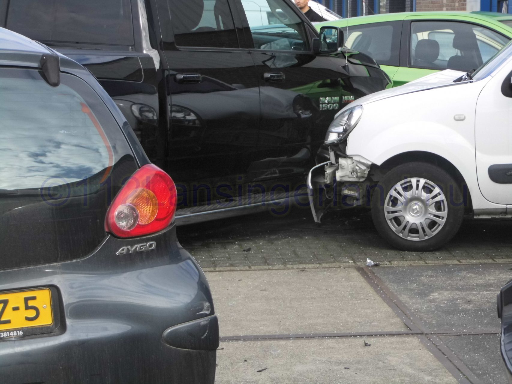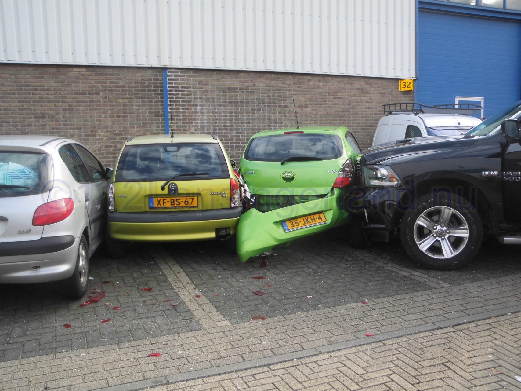 Één van de voertuigen is tot stilstand gekomen tegen 4 geparkeerde auto’s, waarna deze flinke schade opliepen.
