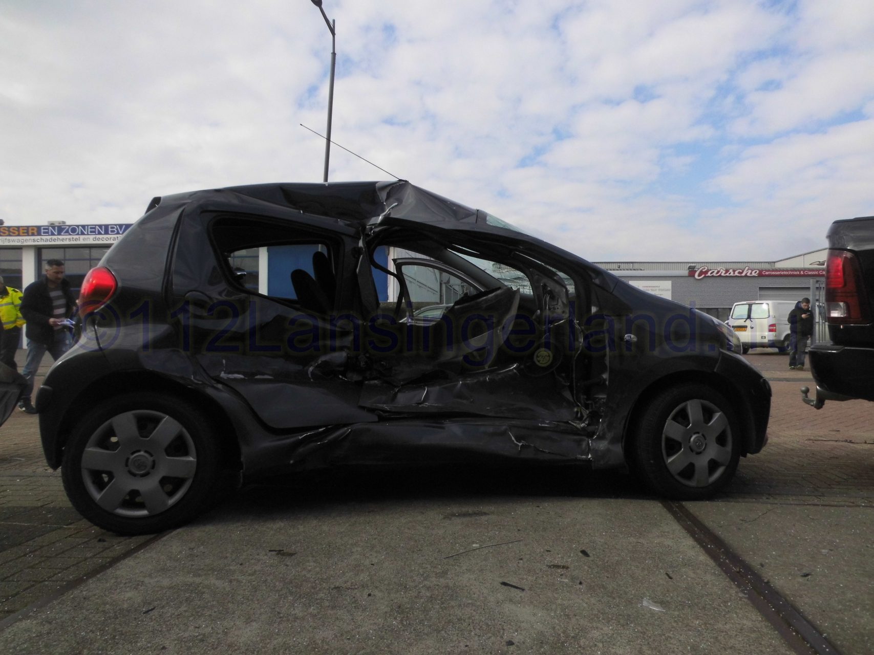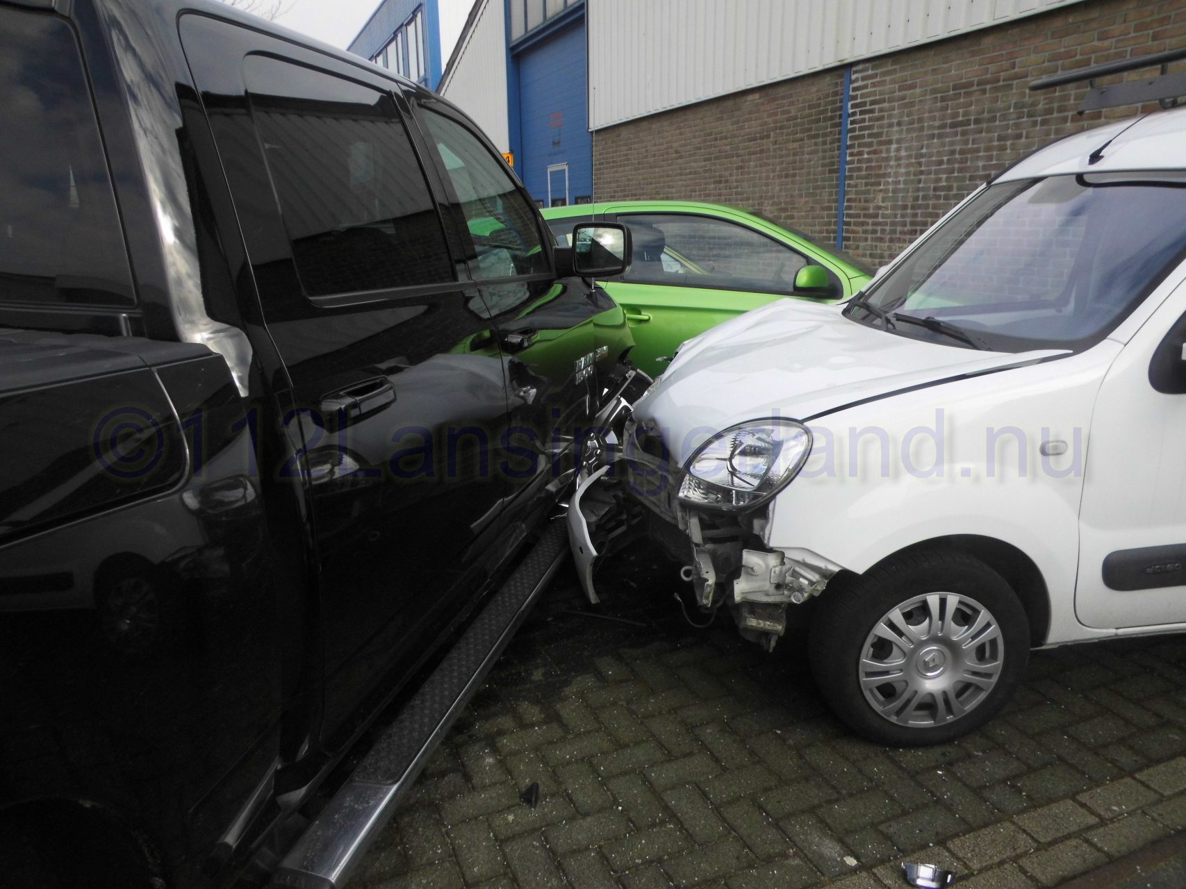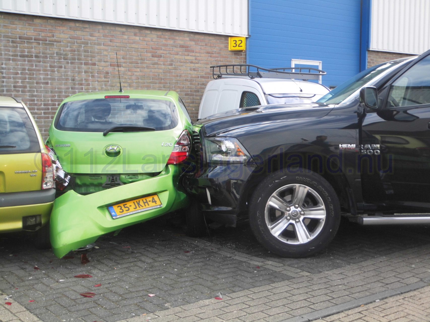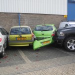 Één van de voertuigen is tot stilstand gekomen tegen 4 geparkeerde auto’s, waarna deze flinke schade opliepen.