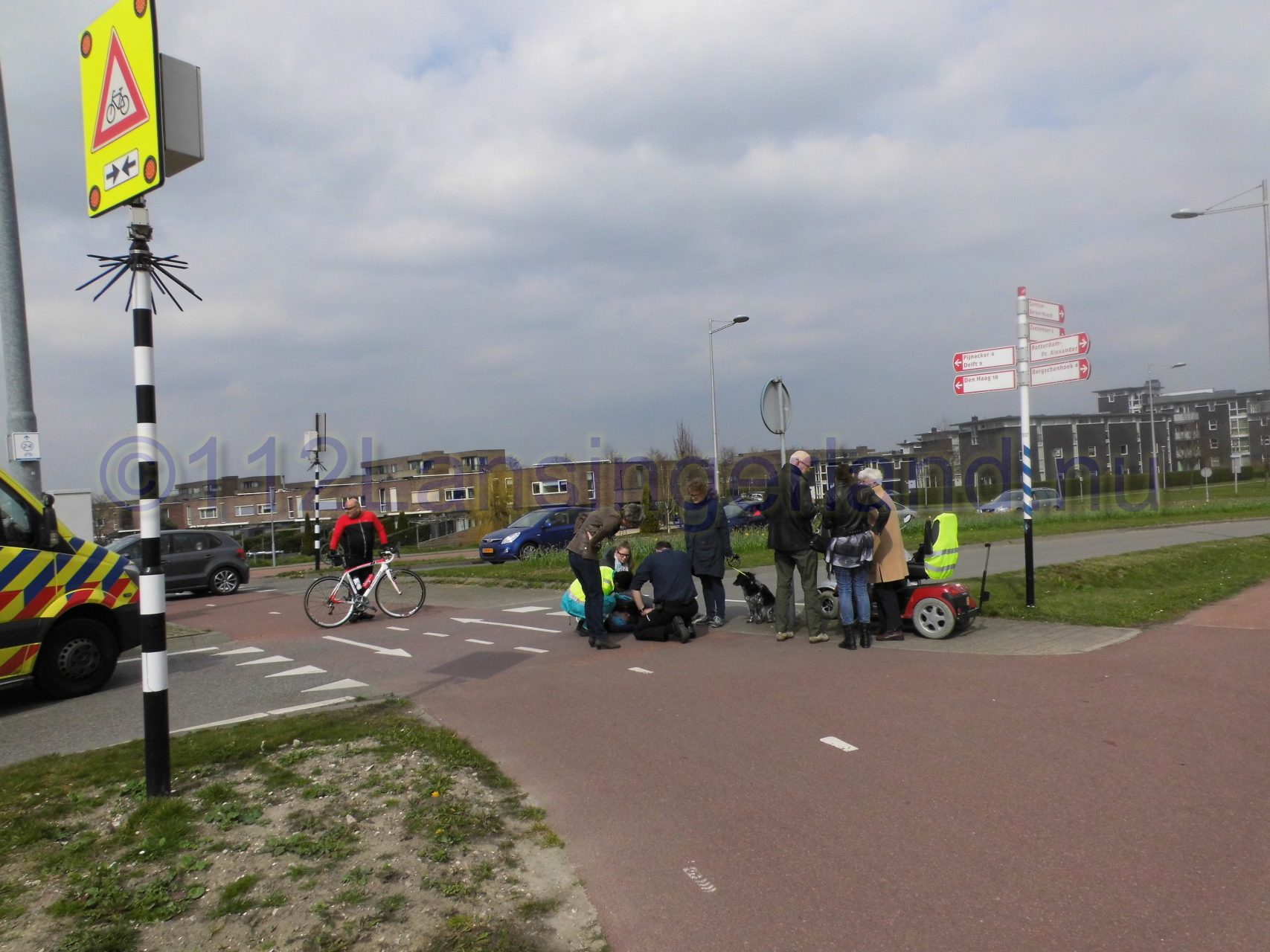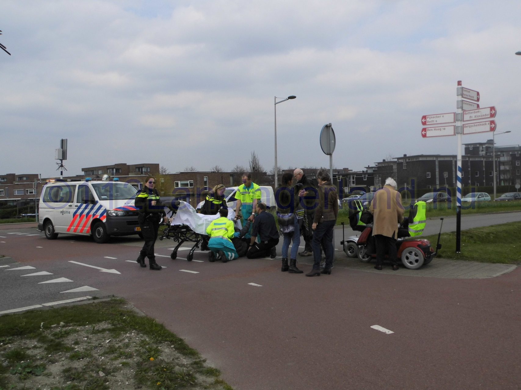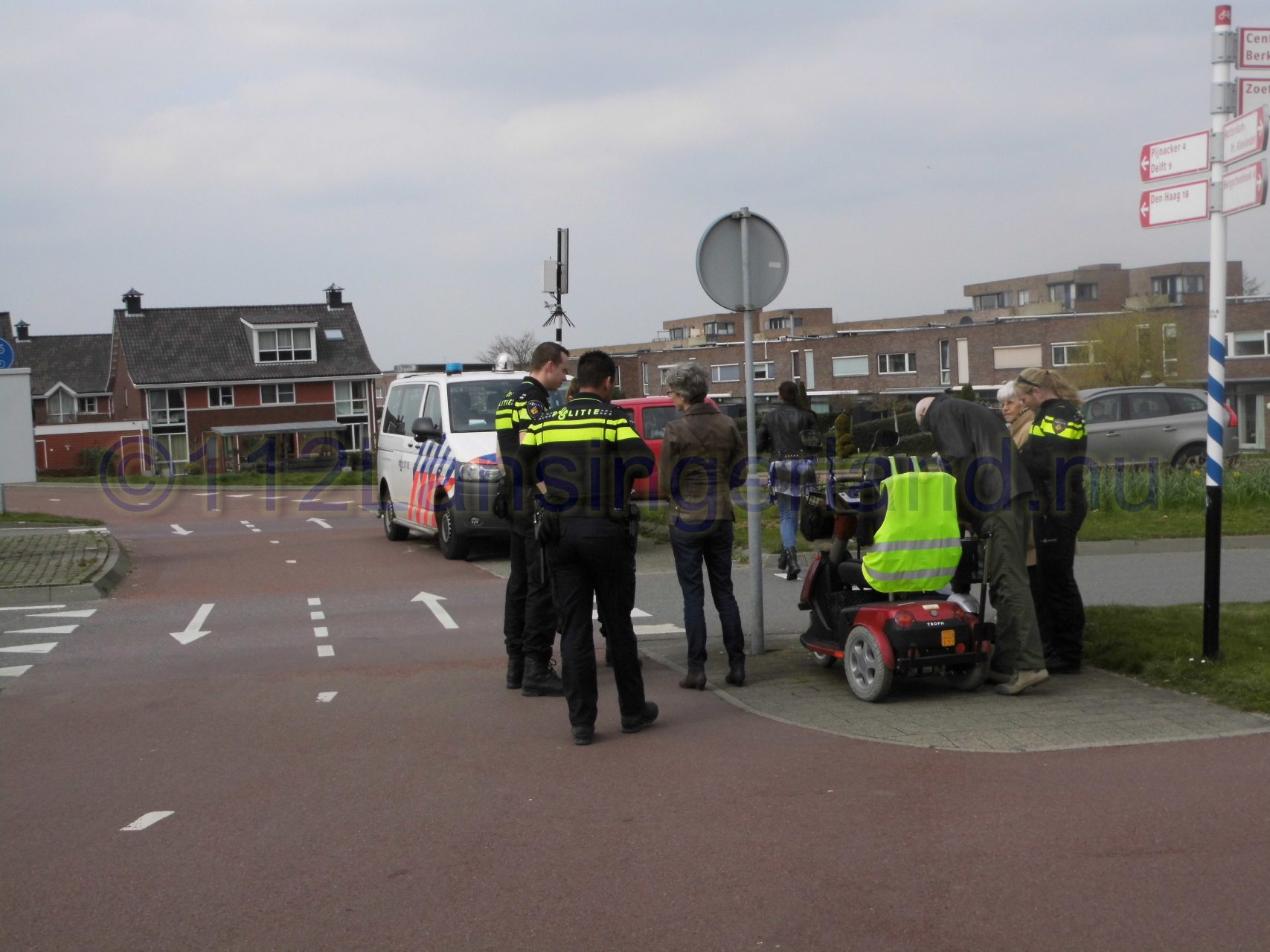 Een oudere dame is hier met haar scootmobiel aangereden door een personenauto, de vrouw is behandeld door het ambulancepersoneel. Beide voertuigen hebben lichte schade opgelopen. Het verkeer is even tijdelijk gestremd geweest om het slachtoffer te kunnen verzorgen. De politie heeft verklaringen opgenomen van een aantal getuigen.
