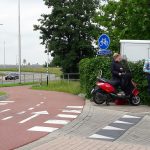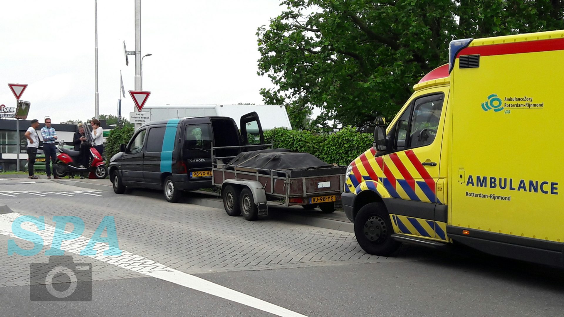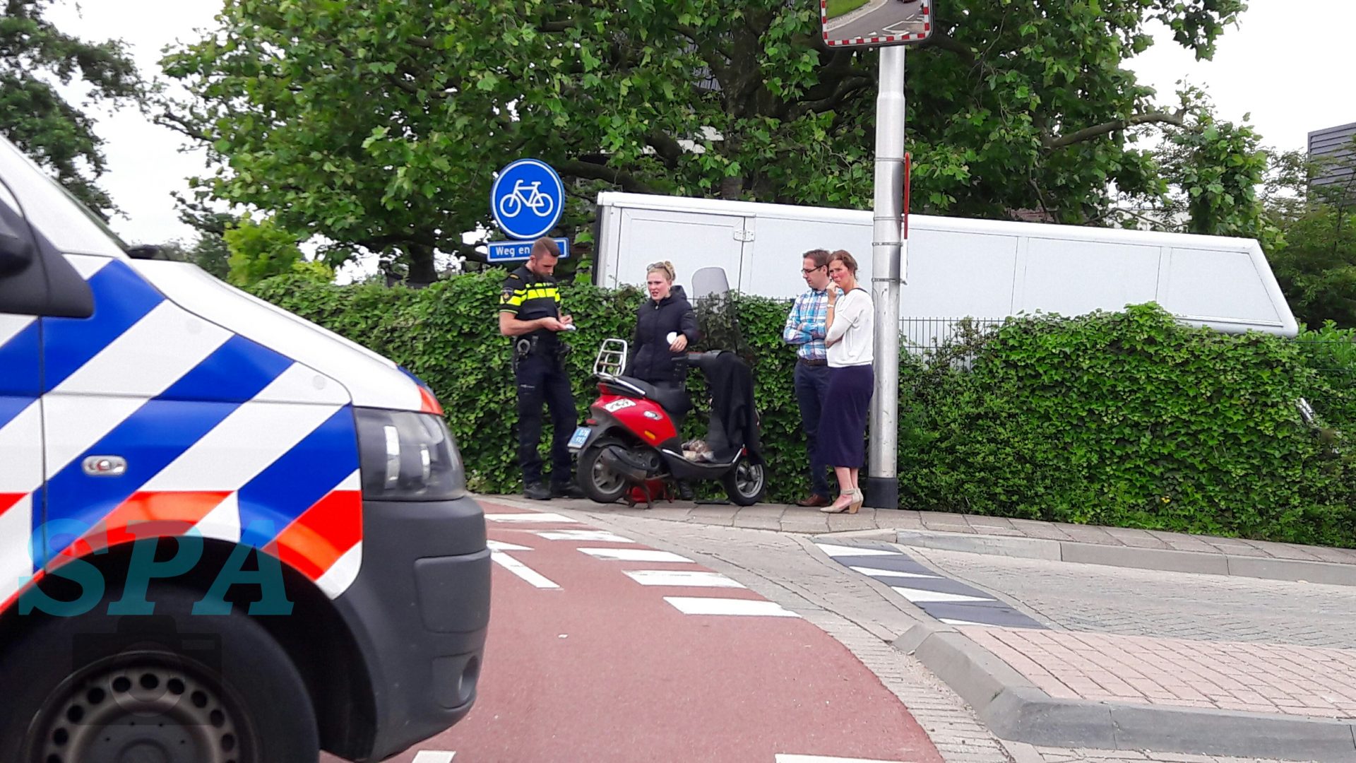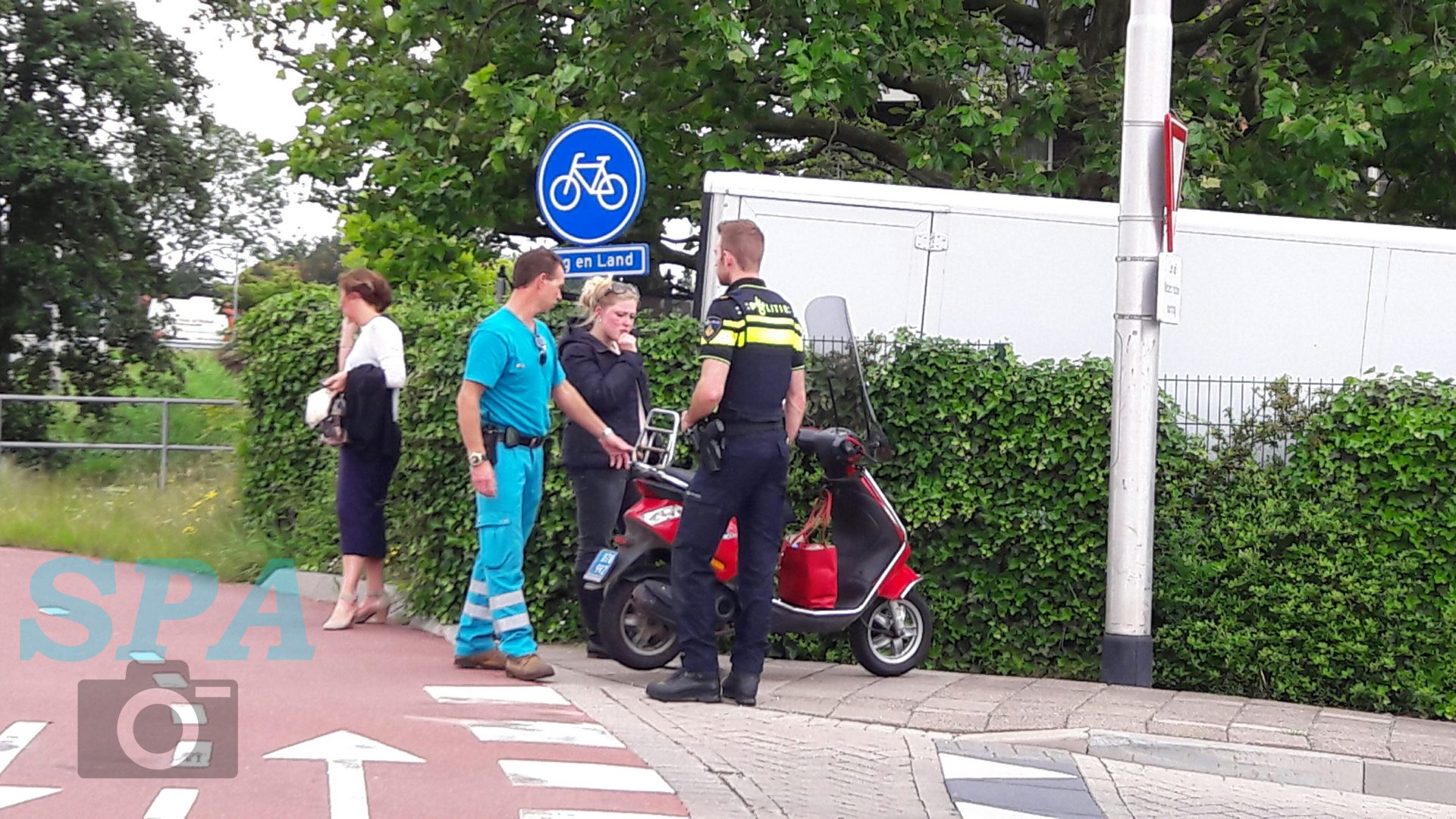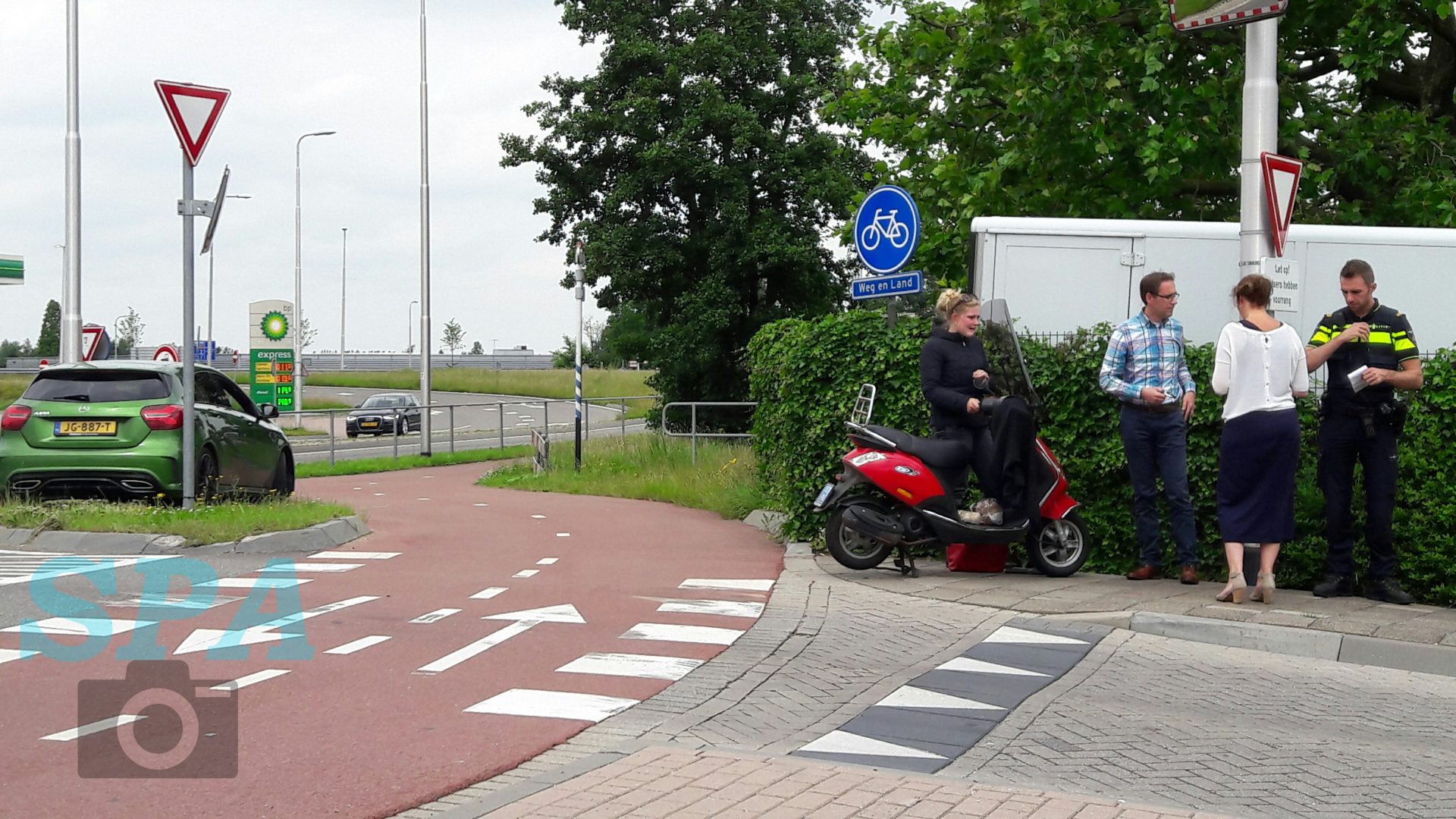 Bij de afslag van de rotonde aan de Weg en Land had er een aanrijding plaatsgevonden tussen een personenauto en een scooter. De scooterrijder is hierbij hard ten val gekomen. De rotonde staat er om bekend dat deze erg onoverzichtelijk is. De automobilisten die naar boven op de rotonde rijden zien de fietsers en scooters van de andere kant niet goed aankomen.
