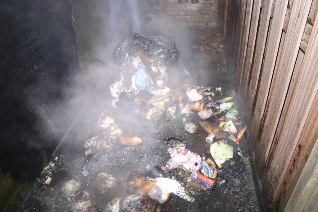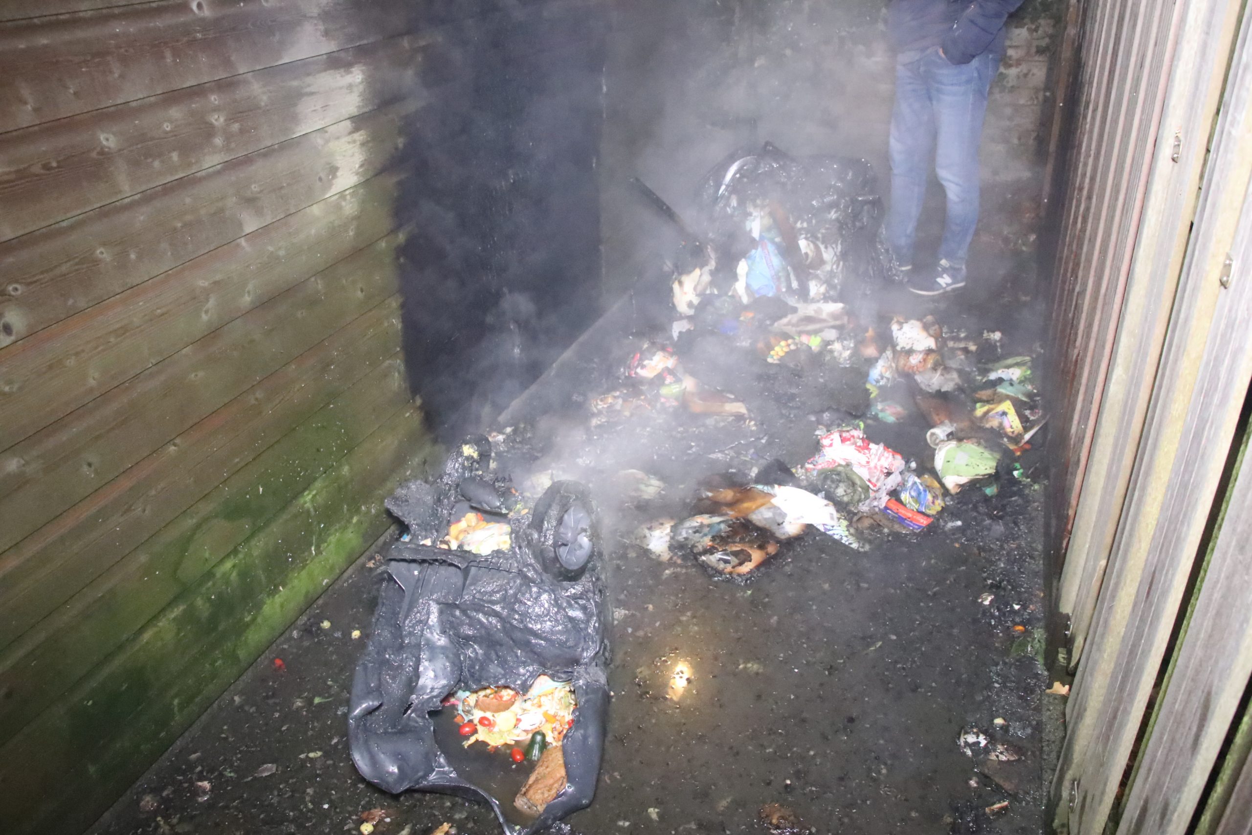 Deze containers stonden tegen een schuur aan, de brandweerlieden wisten de brand snel te blussen.