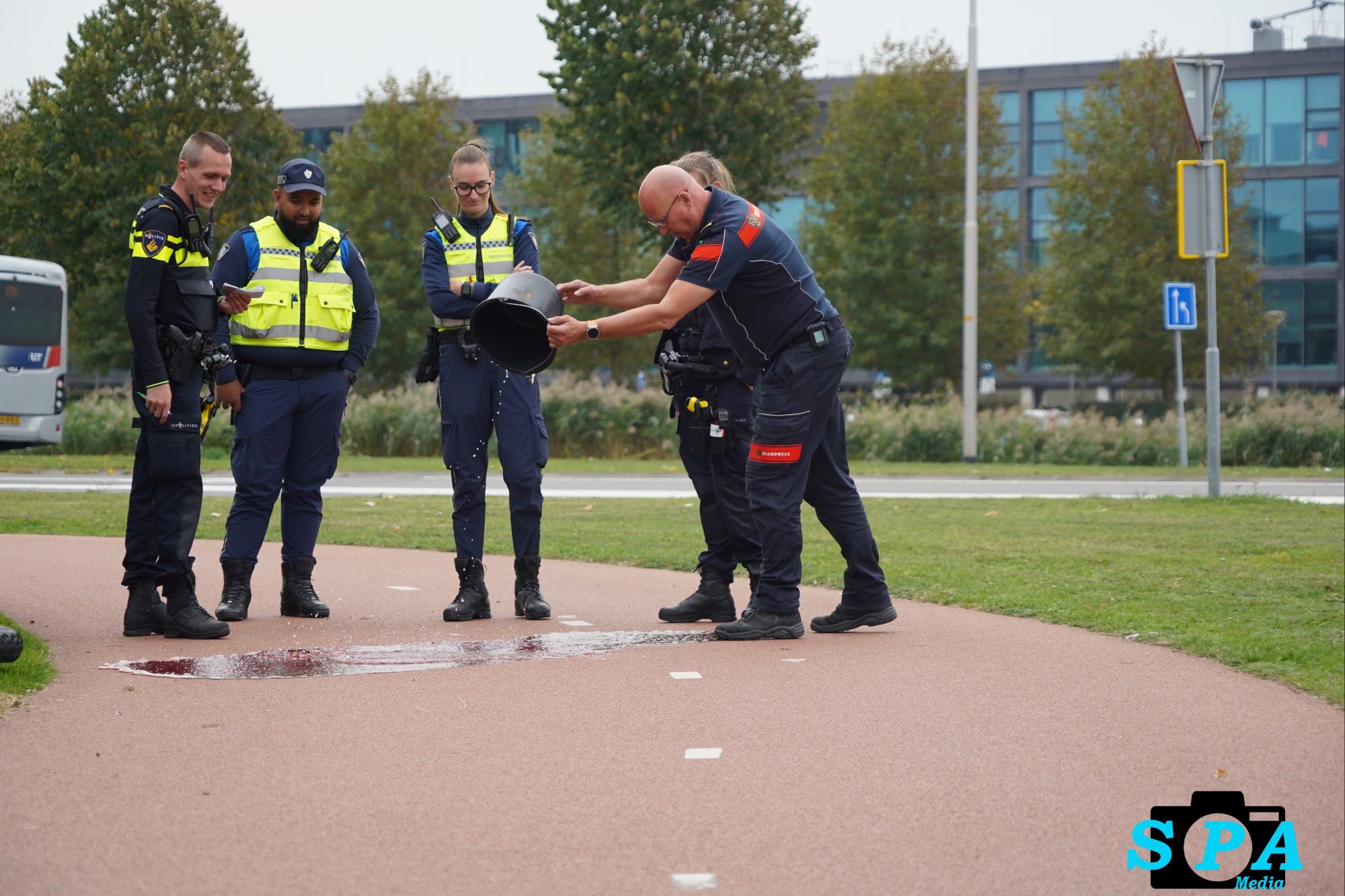 De brandweer is korte tijd ter plaatse geweest om het fietspad schoon te maken vanwege de hoeveelheid bloed die op het wegdek lag.