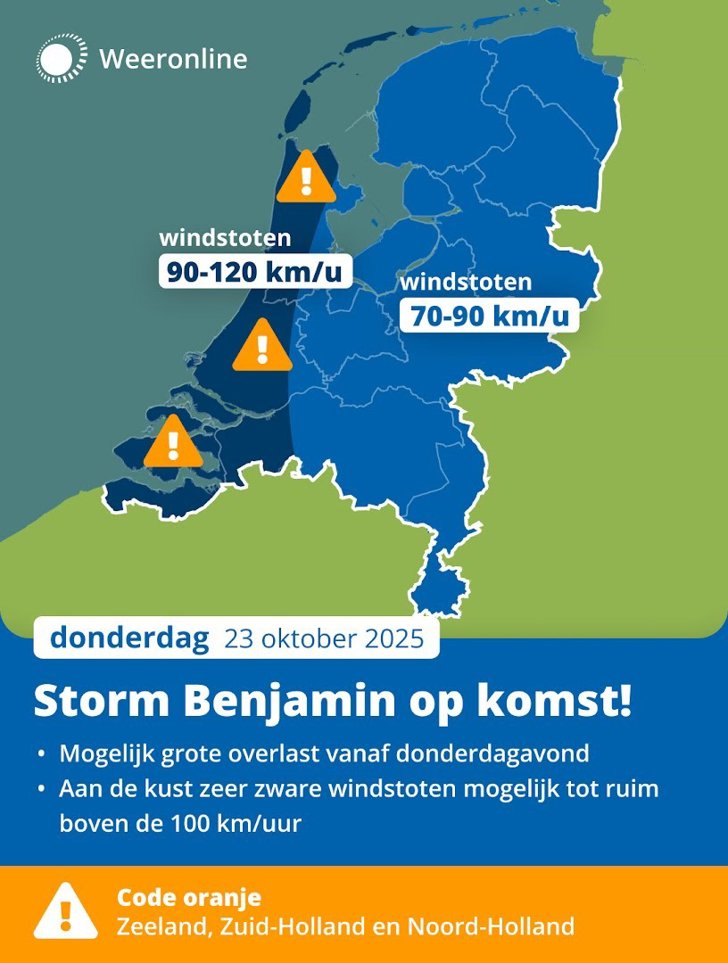 Donderdagmiddag trekt storm Benjamin over het land. In grote delen van Nederland wordt het onstuimig met veel wind en fikse regenval. Het KNMI heeft voor Zeeland, Zuid-Holland en Noord-Holland code oranje afgegeven vanwege zeer zware windstoten die aan zee kunnen oplopen tot ruim boven de 100 kilometer per uur.