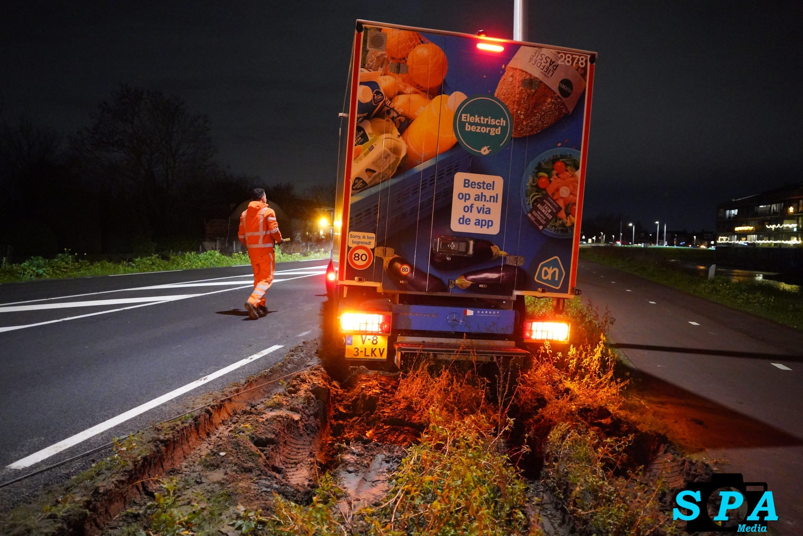 Een bergingsbedrijf kwam ter plaatse en wist de bestelwagen weer uit de berm te trekken. Daarna kon de bezorger zijn route vervolgen met hopelijk alsnog alles netjes op tijd in de kratten. En tja… dat is het lekkere van Albert Heijn.