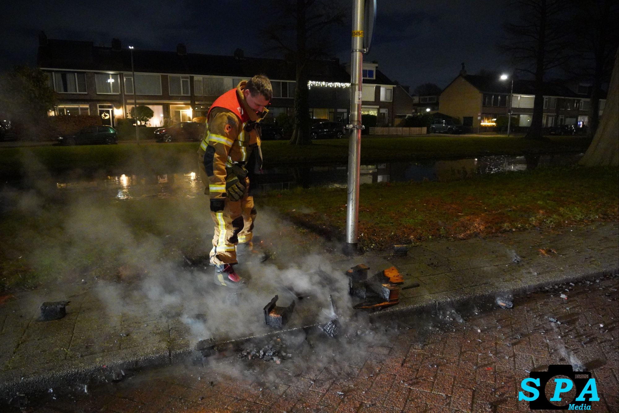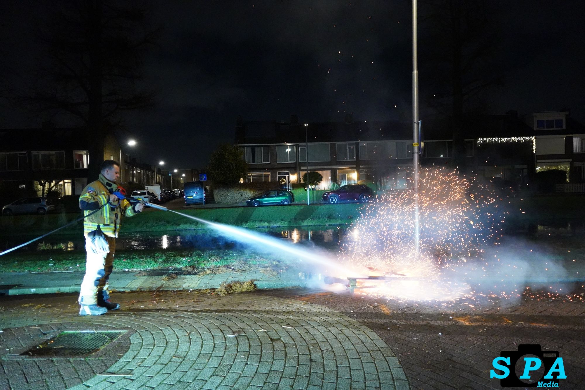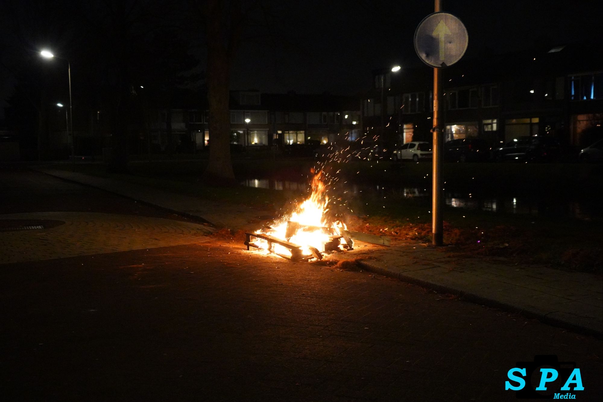 Op straat was een klein vuurtje gestookt met stukken hout, waarin ook vuurwerk was gegooid. De brandweer kwam ter plaatse om het vuur te blussen. Bij aankomst van de brandweer zette een groepje jongeren het op een rennen.