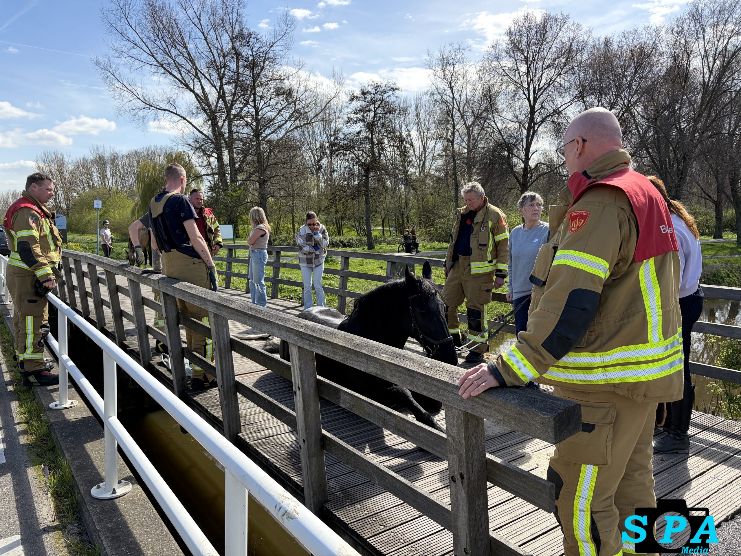 De brandweer werd gealarmeerd en kwam met het Snel Interventie Voertuig (SIV) en een tankautospuit ter plaatse. Het dier werd uit het gat in de brug bevrijd, maar wilde vervolgens niet meer opstaan. Met man en macht werd geprobeerd het paard weer op de benen te krijgen.
